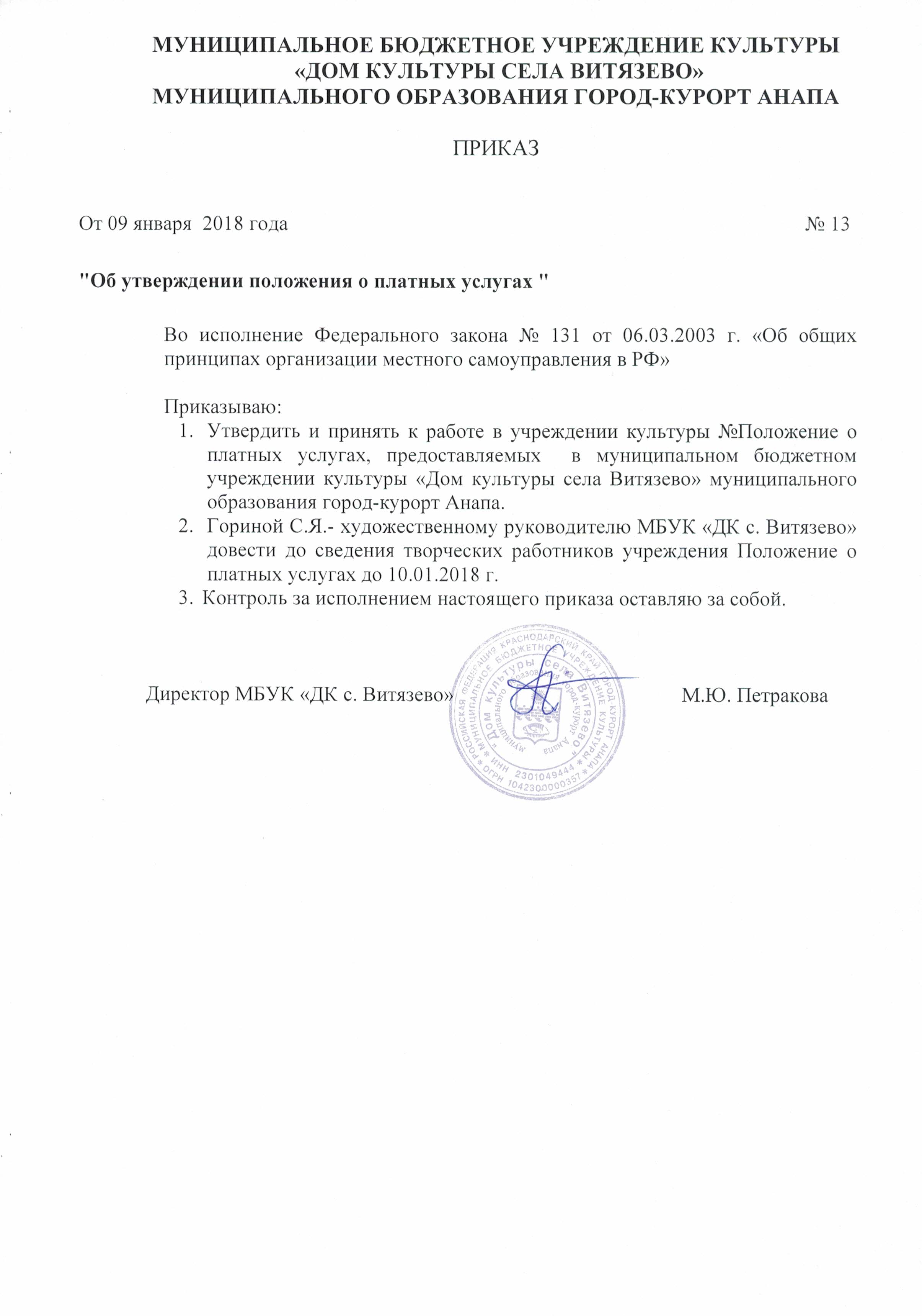 Приказ № 13 от 09 января 2018 года "Об утверждении положения о платных услугах"